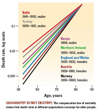The convergence of the death rates reflects the fact, that there is a (universal) maximum lifespan for a given species. The different curves for different populations correspond to different mean life spans ("rectanglification of the mortality curve").