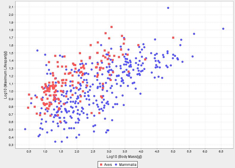 To test this hyothesis I have ploted data, taken from AnAge database which is a great source of ageing related data.